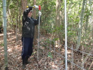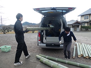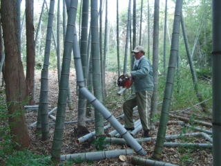 竹薮でチェンソーを使って太いモウソウ竹を切り、車に運びます。