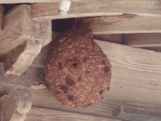 最近では珍しいスズメ蜂の巣です。お堂のノキ下に作りました |