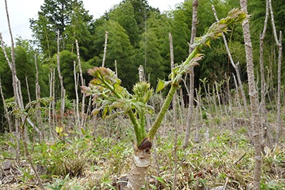 本堂の裏山に昔から自生しているタラの木です。周囲の木・竹・雑木等を切り、タラだけを残し育てています