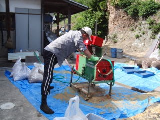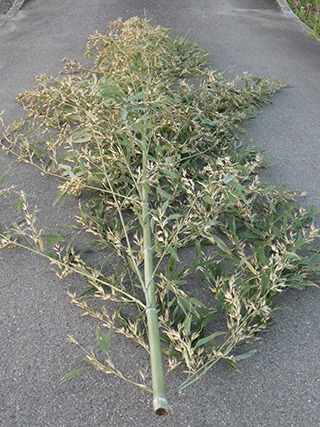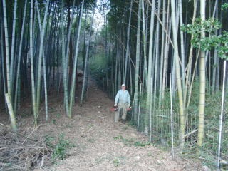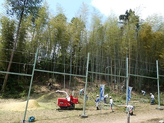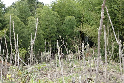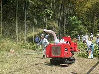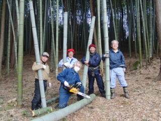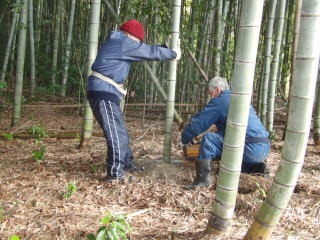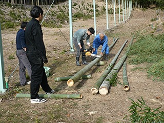 竹薮でチェンソーを使って太いモウソウ竹を切り、車に運びます。