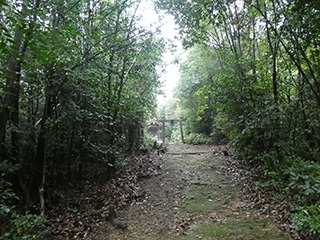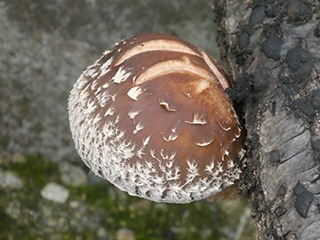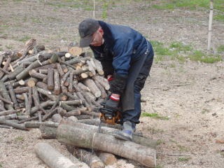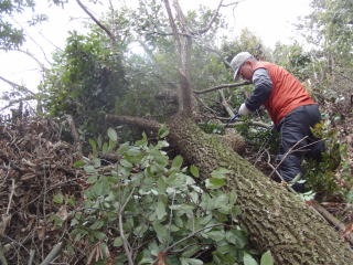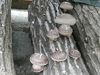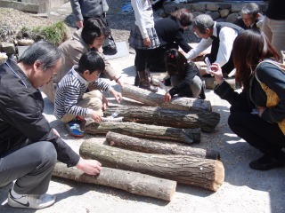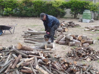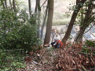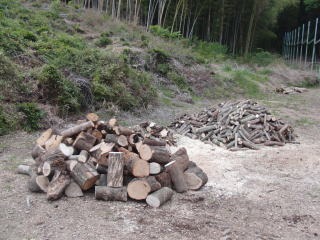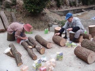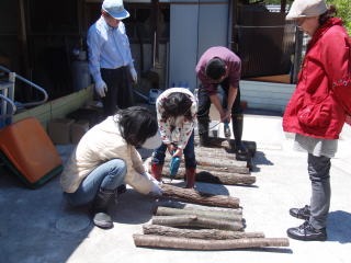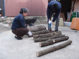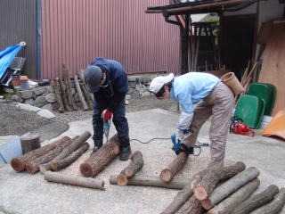 寺の裏山から原木のクヌギ(ドングリ)などを切る |