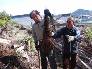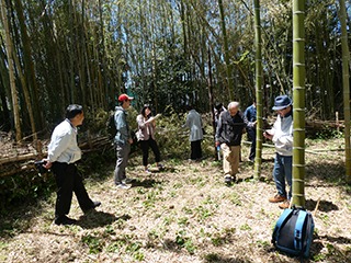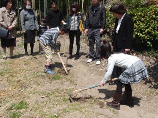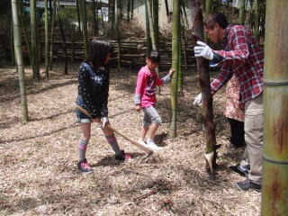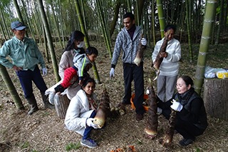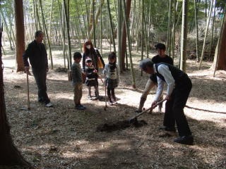 大人も子供も、家族で楽しくタケノコ掘り。靴さえあれば普段着のままでOKです。 |